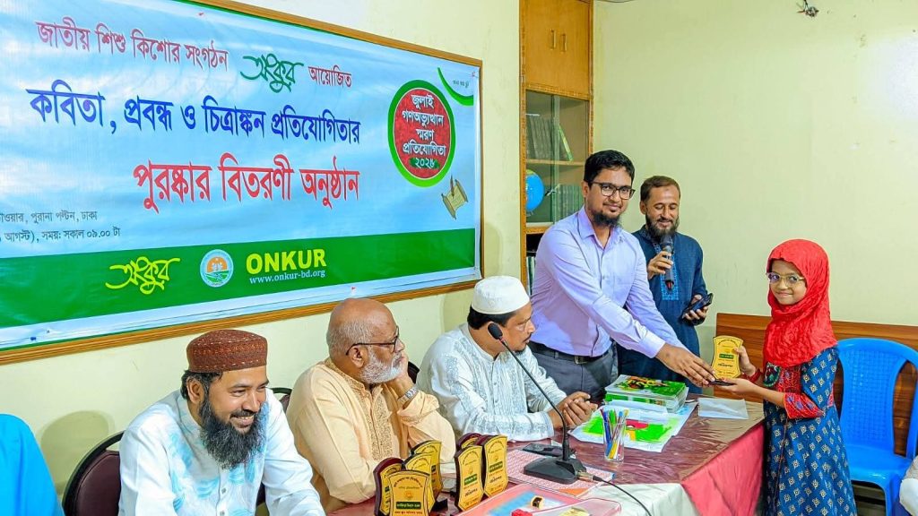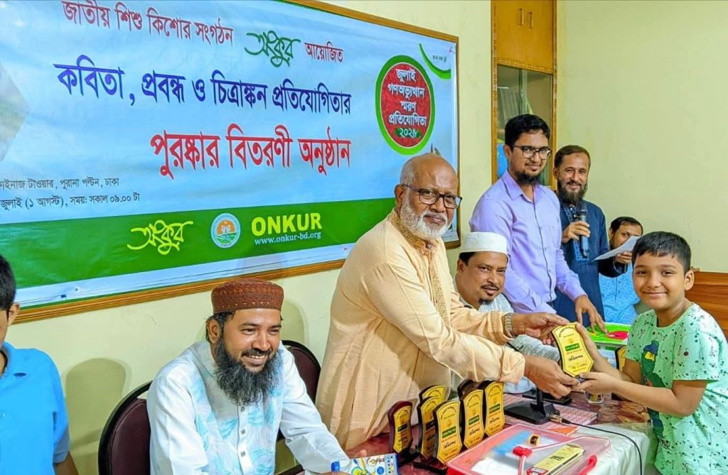 ১ আগস্ট শুক্রবার সকালে জাতীয় শিশু কিশোর সংগঠন অংকুর এর উদ্যোগে রাজধানীর ট্রাস্ট মিলনায়তনে জুলাই গণঅভ্যুত্থান স্মরণ প্রতিযোগিতা ও পুরষ্কার বিতরণী অনুষ্ঠিত হয়েছে। প্রবন্ধ, কবিতা ও চিত্রাঙ্কন এই ৩টি ইভেন্টে ৫ টি গ্রুপে বিজয়ী ১৯ জনের হাতে ক্রেস্ট ও পুরষ্কার তুলে দেন অতিথিরা।
